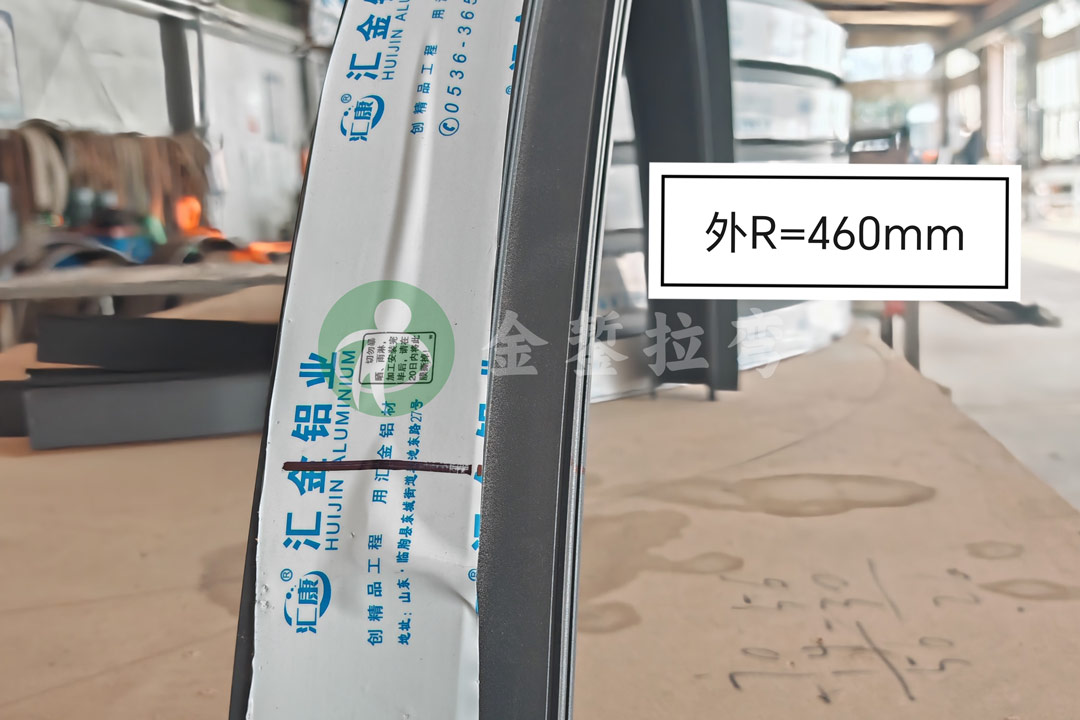 样品参数:R=900mm; 型材类型:50×100铝方通; 应用工程:大型候车厅装饰吊顶、高档别墅铝艺大门; 最小半径:R=700mm